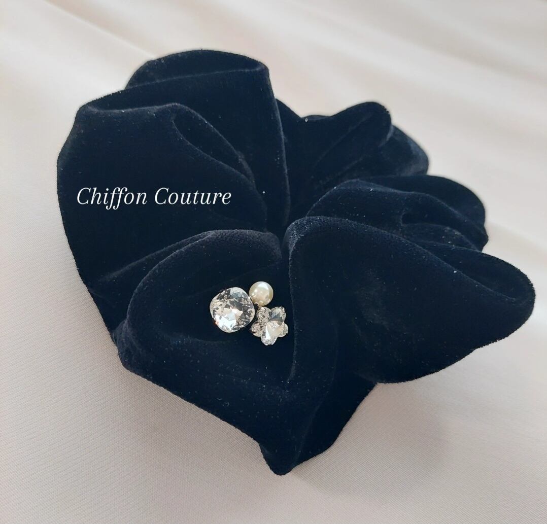 スワロフスキー製クリスタルとパールのワンポイントでエレガントで可愛いシュシュに仕上げました。
