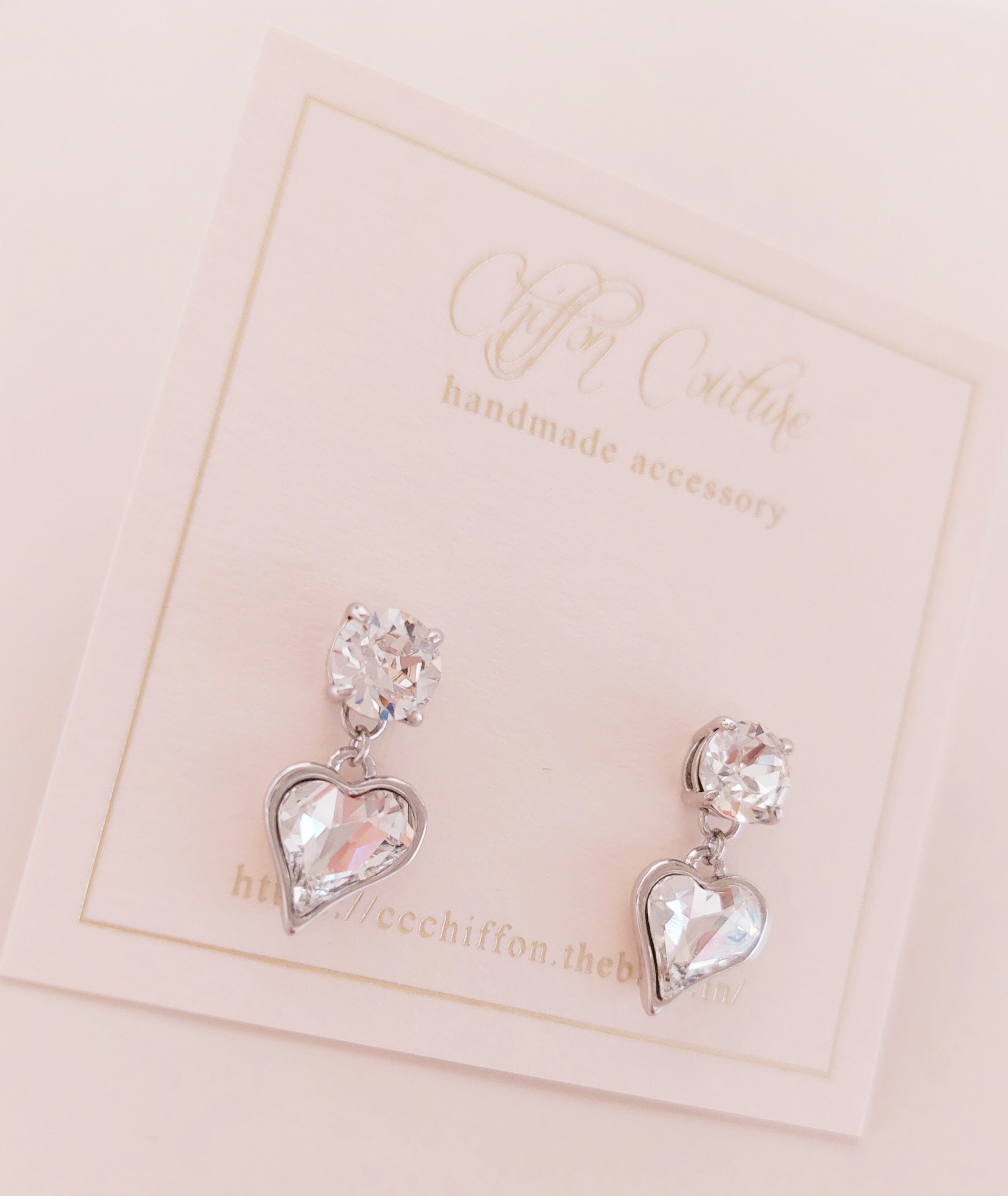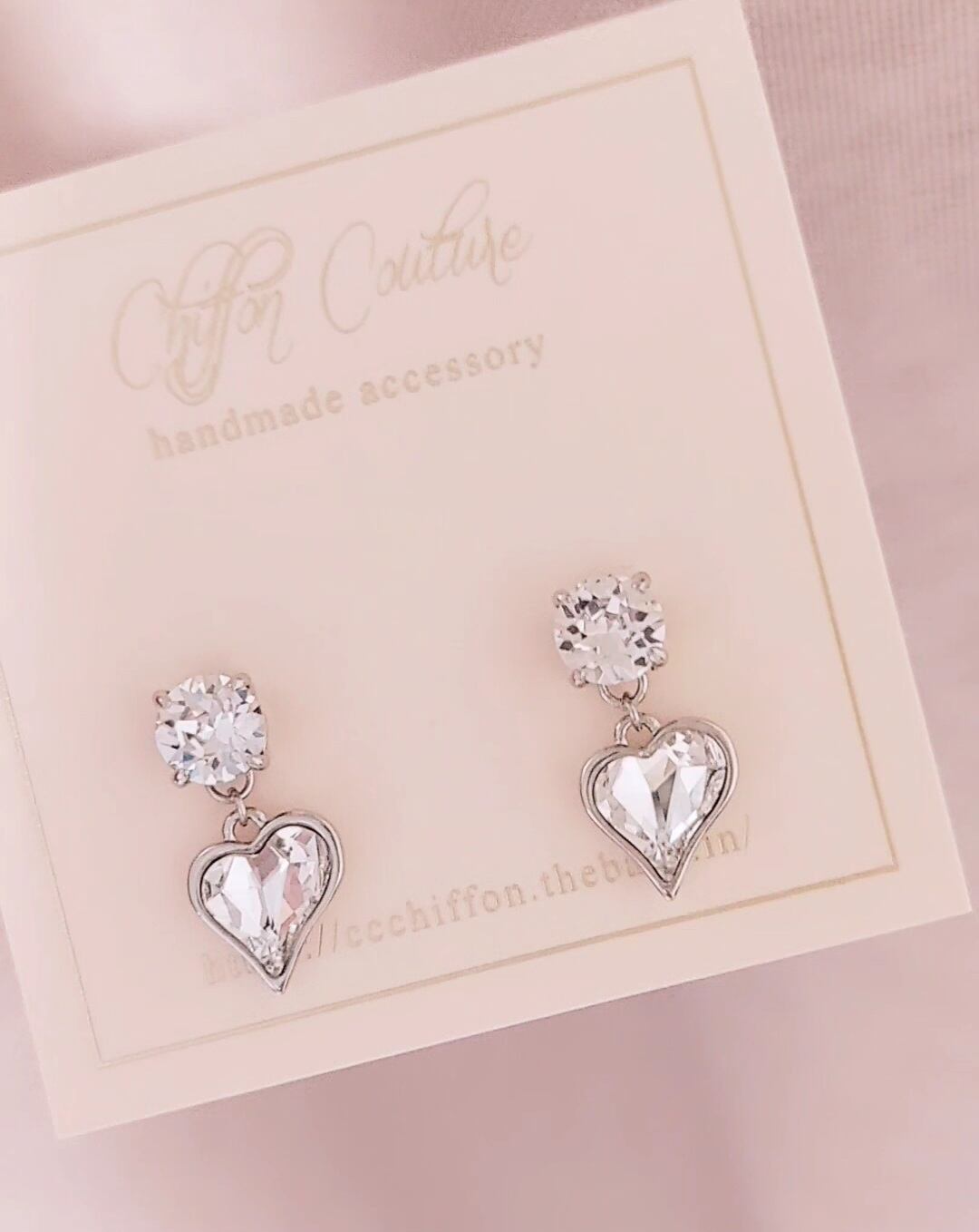 ジュエリーライクな石座金具を使用し、スワロフスキー製クリスタルのラウンド型とハートモチーフを組み合わせたピアスです♡
