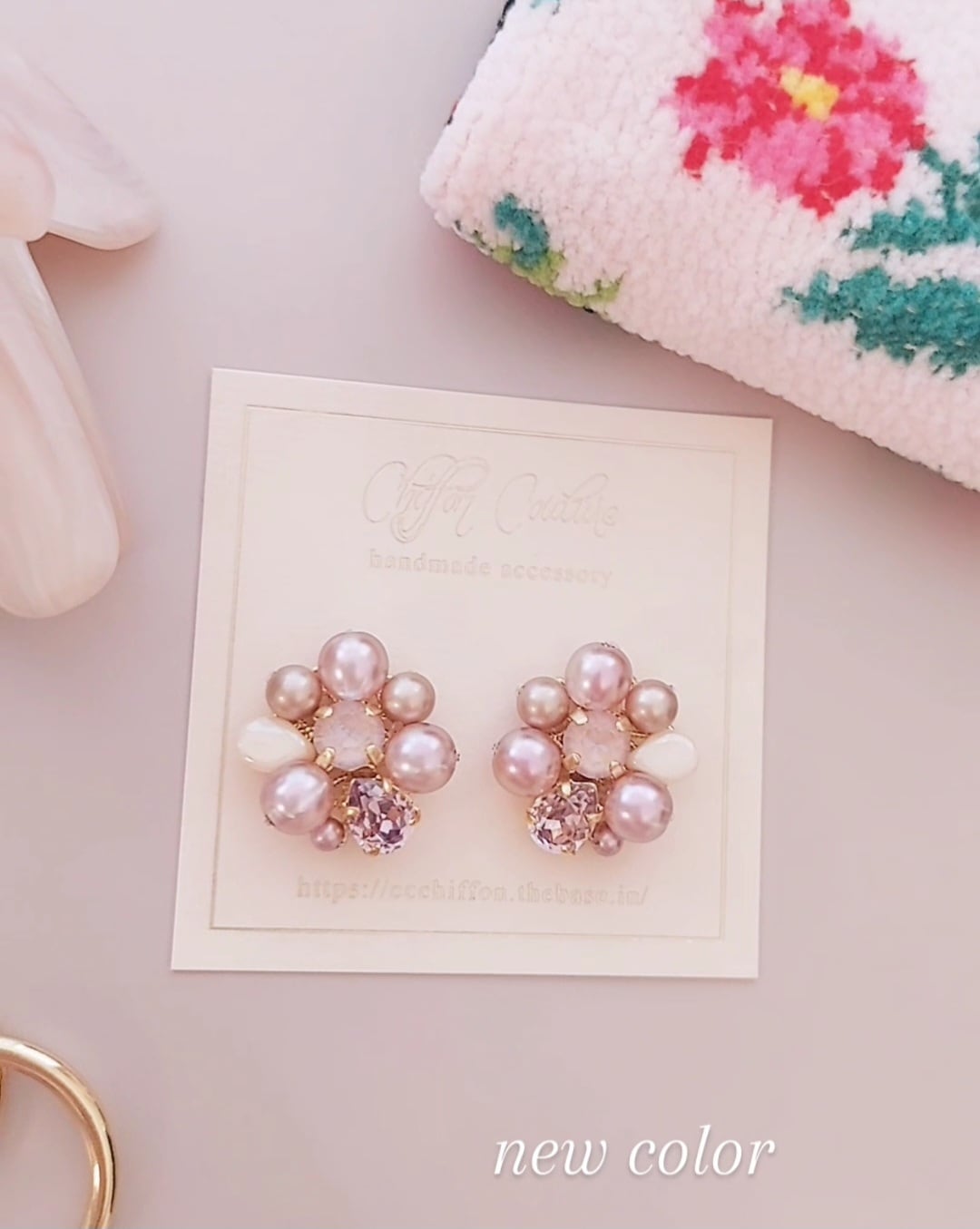 ミルキーホワイトの花びらやベージュパールも合わせて甘すぎないピンクに仕上げたフラワーモチーフは春らしさもあり上品な印象です♡