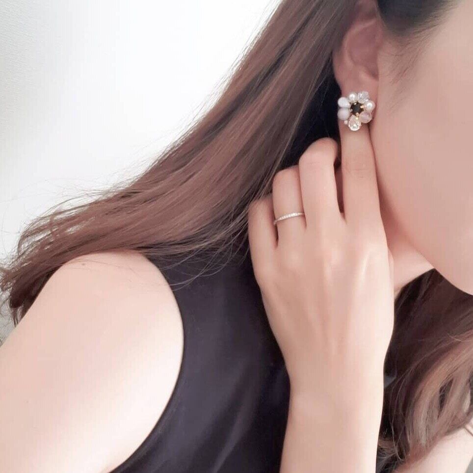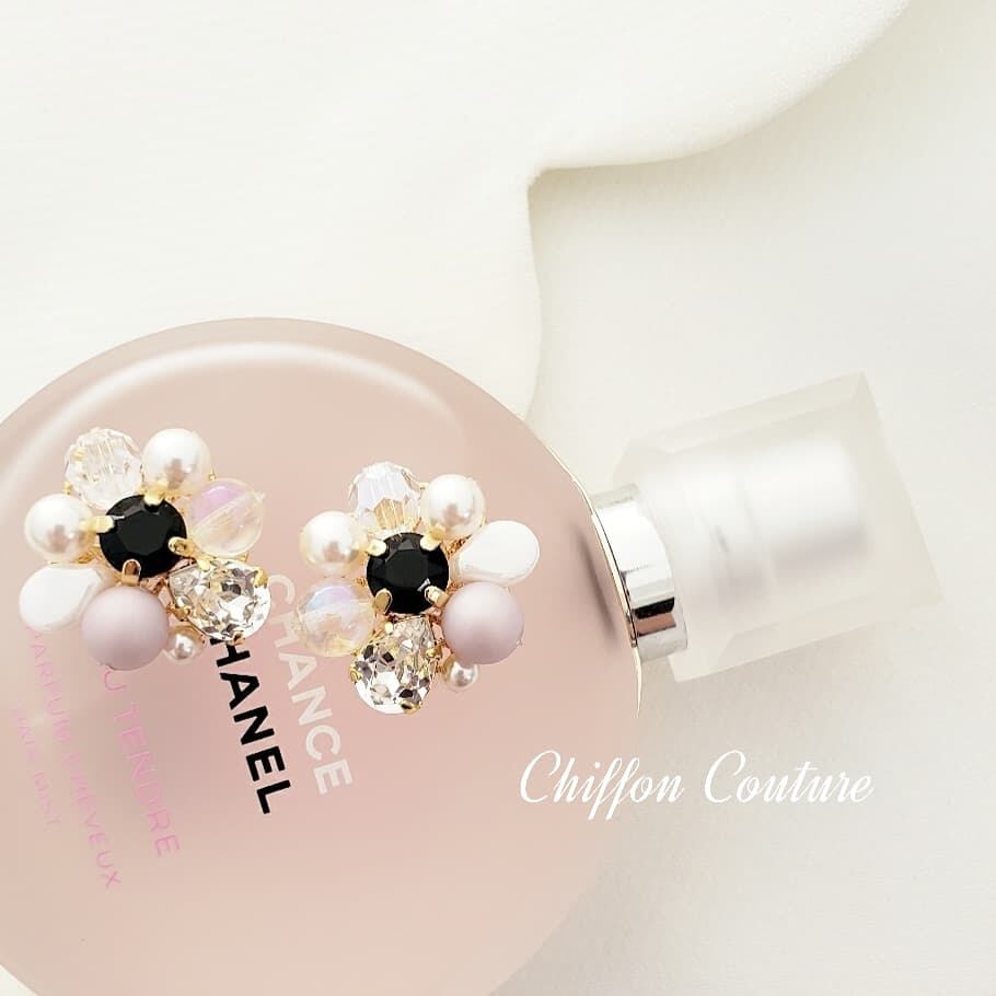ブラック、クリスタルのスワロフスキーにくすみカラーが大人可愛いモーヴピンクのパールをポイントに仕上げました。
