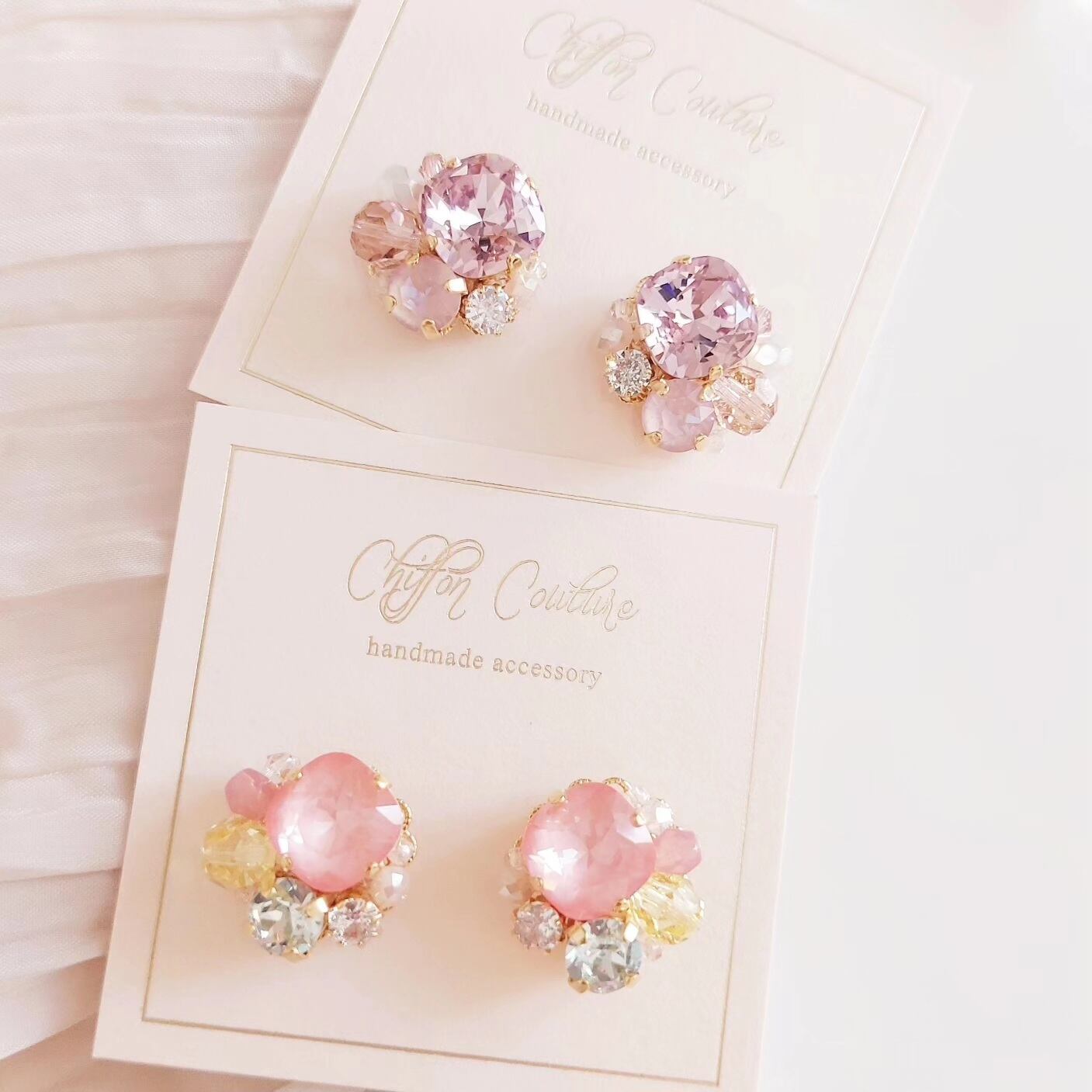 メインの大粒のスワロフスキーはライトアメジスト、周りにはダスティピンクやヴィンテージローズなど全体的に見て透き通るような軽やかなピンクパープルカラーで組み合わせました♪︎
