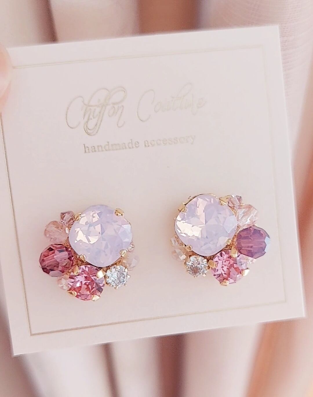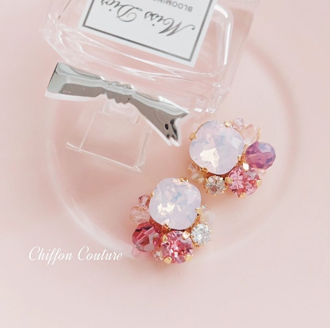 メインの大粒のスワロフスキーはローズウォーターオパール、周りにはライトローズやシクラメンオパール、ローズピンクなど大人のピンクカラーで組み合わせました♪︎